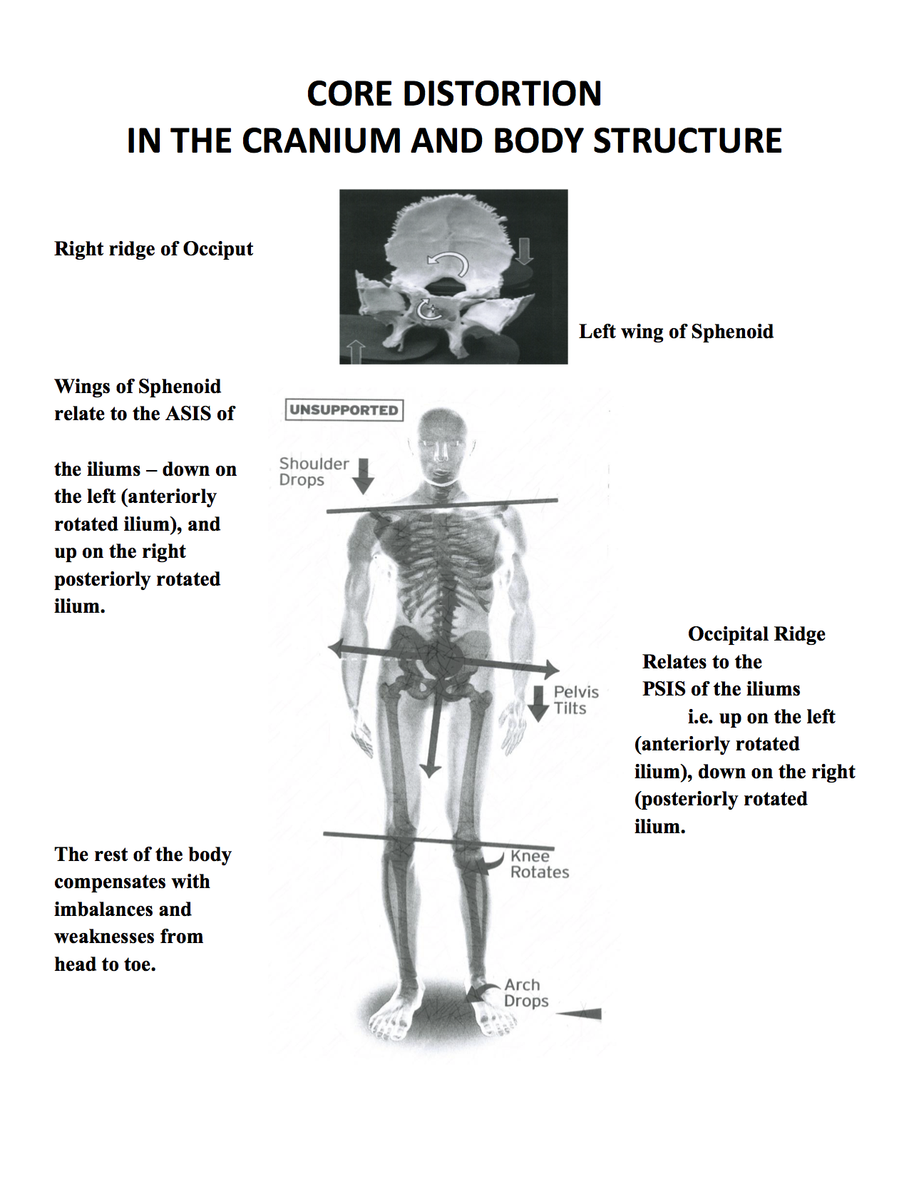 It develops first within cranium at the Sphenoid and Occiput bones, and in turn, spirals through our spine and into our pelvis. This causes and anterior tilt of our left ilium, posterior tilt of our right ilium, a tilting of the sacrum resulting in a lack of weight bearing support. This is the underlying cause of scoliosis (curvature of the spine) as the body begins to compensate. As well as TMJ (Temperomandibular joint) dysfunction as the the tilting in the pelvis is mirrored in the cranium causing imbalances to the jaw and orbital cavity.